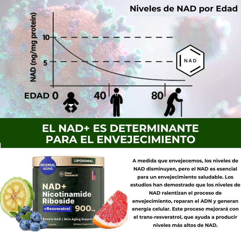 Combate el envejecimiento con el Ribosido de Nicotinamida Liposomal - el sustituto directo de los suplementos de NMN. Ayuda a tu cuerpo a absorber y utilizar el precursor NAD de manera más eficiente, produciendo resultados increibles.