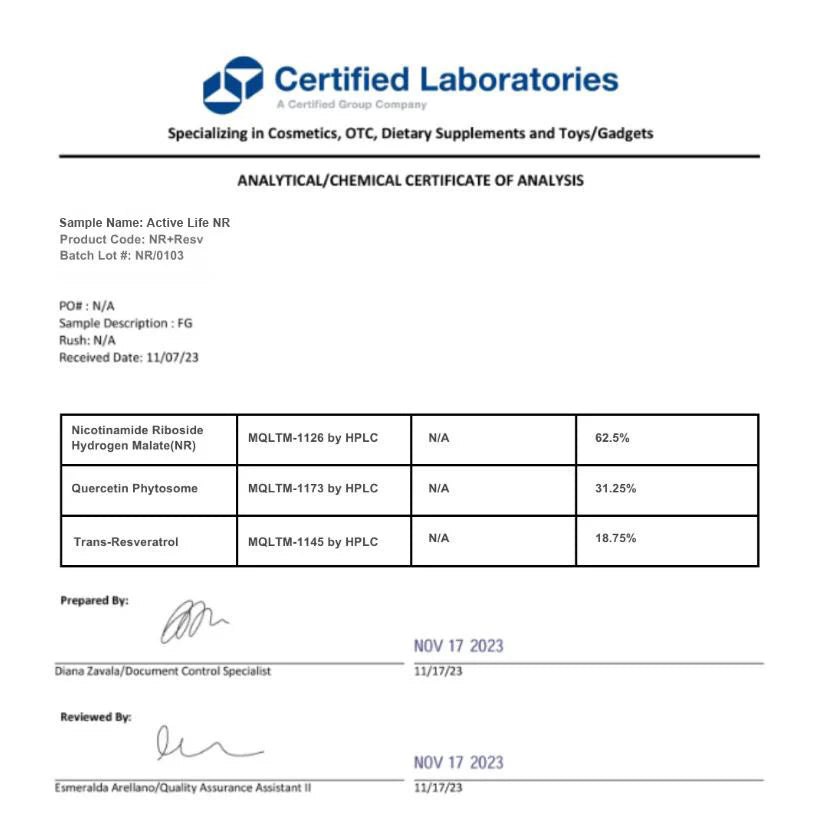 Nuestro suplemento NR está fabricado y probado por terceros en EE.UU. para garantizar su pureza y eficacia. Certificado disponible bajo petición. Vuelve a sentirte lo mejor posible con el suplemento potenciador NAD+.