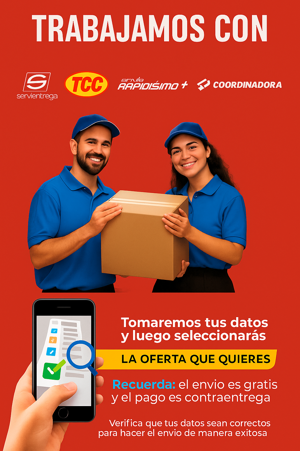 Manejamos envíos gratis con servicio pago contra entrega a todo el país nuestro tiempo de entrega es de 2 a 4 Días Hábiles recuerda tener el dinero completo en EFECTIVO en el momento de la entrega Para que no tengas novedades con la recepción de tu pedido