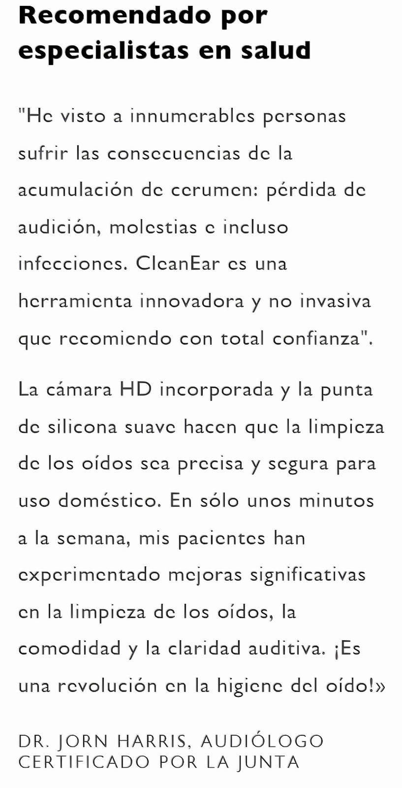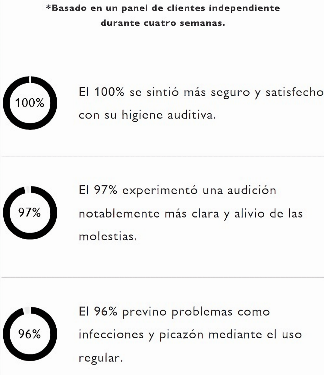 Recomendamos utilizar CleanEar una vez a la semana o según sea necesario, dependiendo de la acumulación de cera en los oídos. El uso regular garantiza: