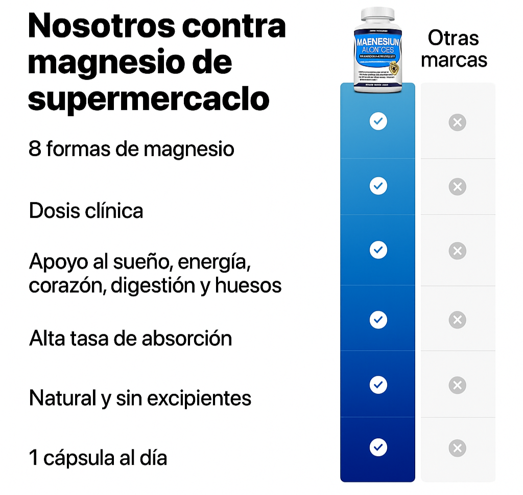 A diferencia de otros suplementos de magnesio que su cuerpo no puede absorber, esta fórmula le brinda las 8 formas más importantes de magnesio, en la más pura calidad y en las cantidades adecuadas que su cuerpo necesita.