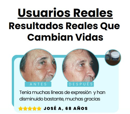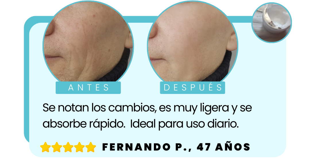 "Siempre fui escéptico con las cremas antiedad, pero decidí probar esta por recomendación de un amigo, y la verdad me sorprendió. En pocas semanas, mi piel se ve más firme, hidratada y con un aspecto mucho más joven. Las líneas de expresión en mi frente y alrededor de los ojos han disminuido notablemente. Además, me gusta que no deja sensación grasosa y se absorbe rápido. Ahora es parte de mi rutina diaria y la recomiendo totalmente. ¡Funciona de verdad!"— Carlos M., 50 años, Cali, Colombia ⭐⭐⭐⭐⭐