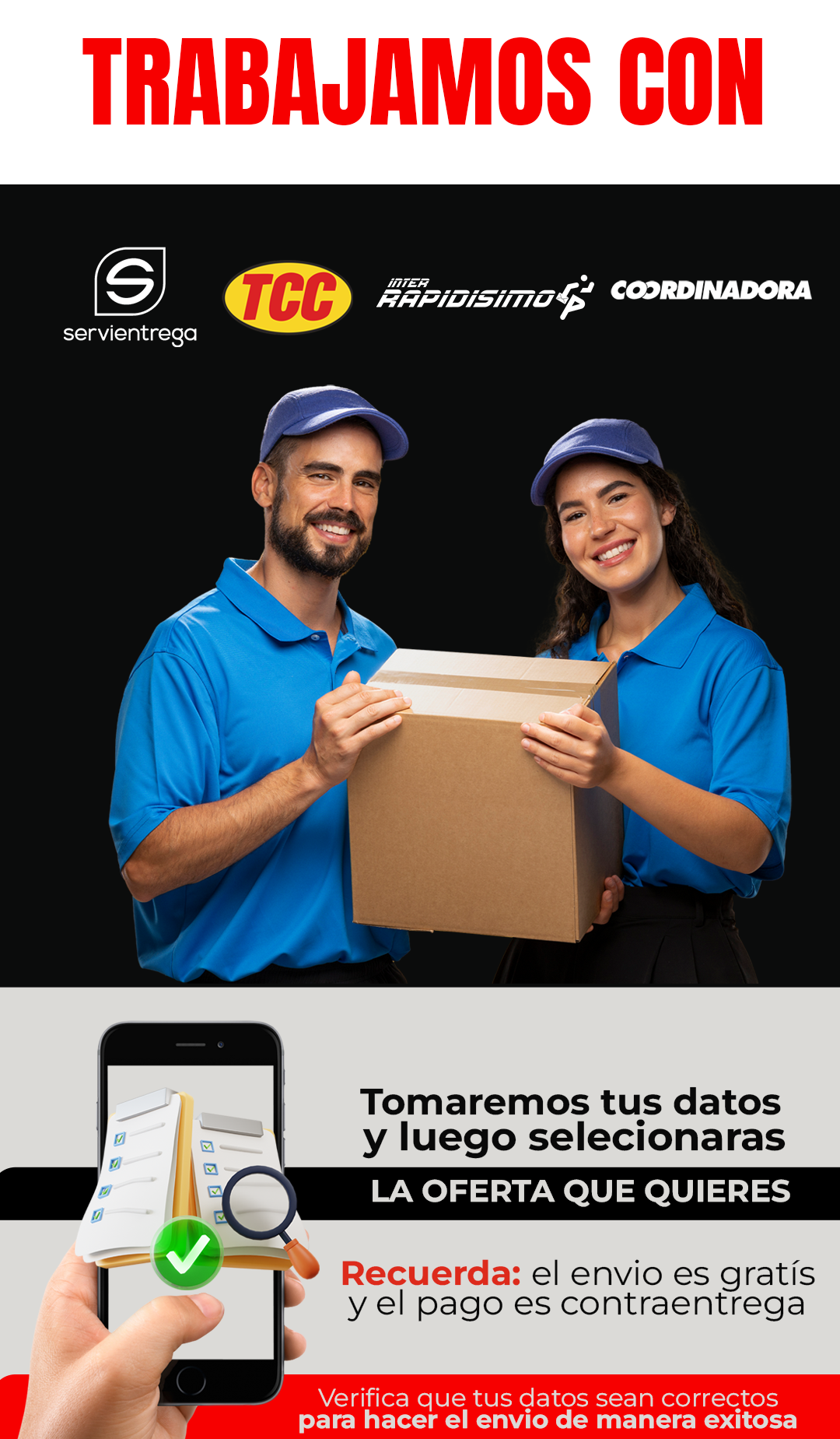 Manejamos envíos gratis con servicio pago contra entrega a todo el país nuestro tiempo de entrega es de 2 a 4 Días Hábiles recuerda tener el dinero completo en EFECTIVO en el momento de la entrega Para que no tengas novedades con la recepción de tu pedido
