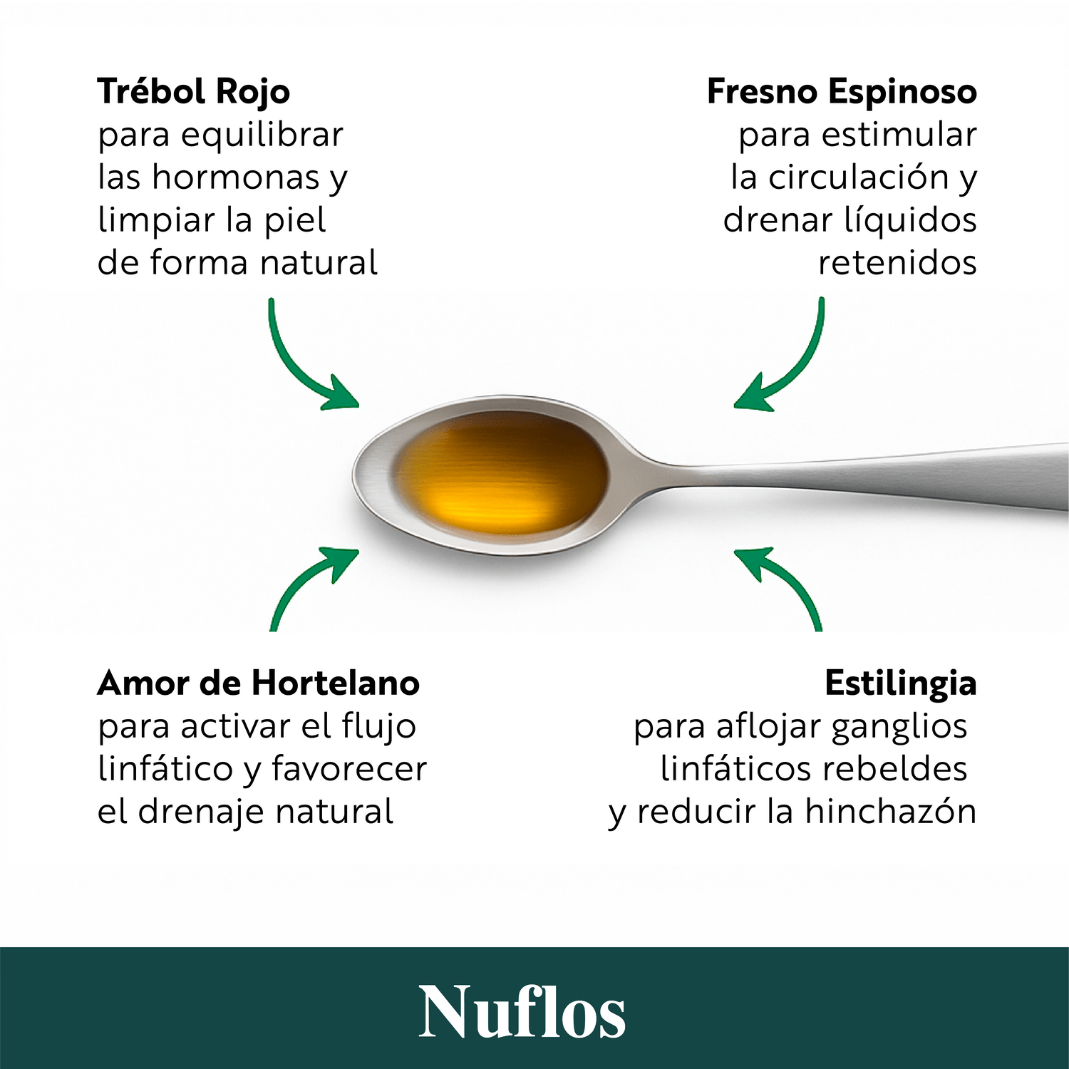 Nuflos se mantiene 100% natural, con solo cuatro hierbas linfáticas comprobadas. Gracias a su mezcla de compuestos vegetales suaves, es la solución más potente de la naturaleza para el drenaje natural — sin estimulantes ni químicos.