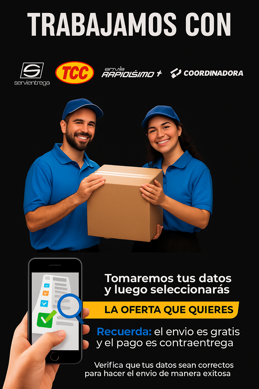 Manejamos envíos gratis con servicio pago contra entrega a todo el país nuestro tiempo de entrega es de 2 a 4 Días Hábiles recuerda tener el dinero completo en EFECTIVO en el momento de la entrega Para que no tengas novedades con la recepción de tu pedido