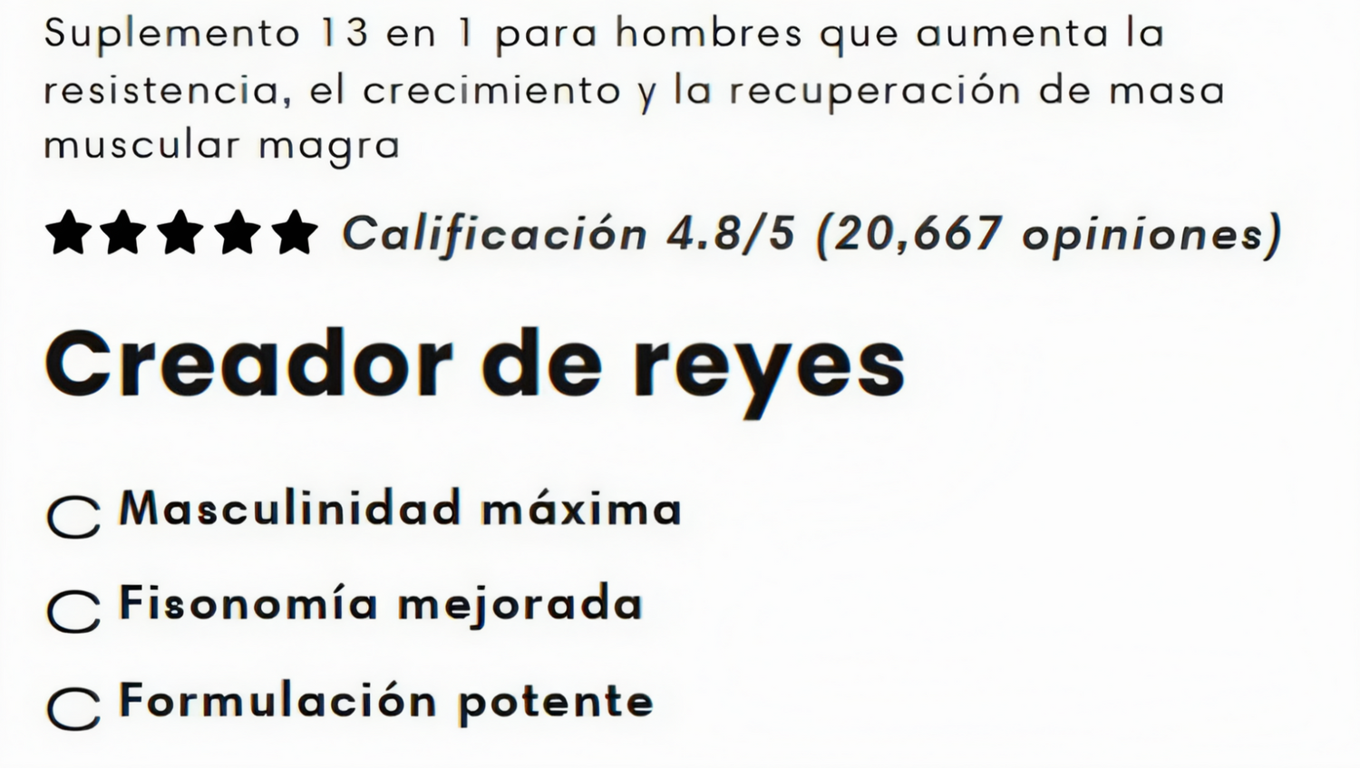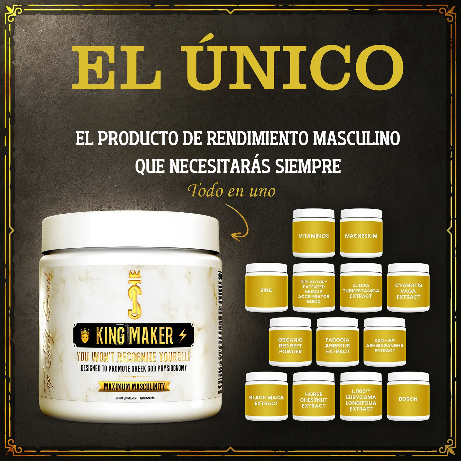 Libere su potencial con King Maker: esta fórmula única permite a los hombres alcanzar la grandeza en todas las áreas de la vida. Realce la fisonomía, eleve el estatus social y potencie su rendimiento con King Maker. Los ingredientes cuidadosamente seleccionados y el compromiso con la excelencia hacen de King Maker la mejor opción para quienes se niegan a conformarse. Reescriba su historia y reine con la supremacía con King Maker.