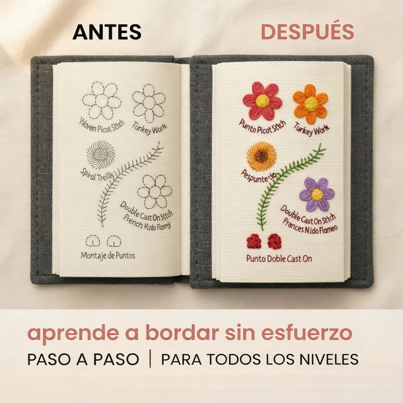 Siempre que seas un novato o un completo principiante, este libro de puntadas tiene una página para cada nivel, comenzando con puntadas simples y guiándote gradualmente hacia diseños más detallados y gratificantes. Explore una variedad de técnicas como puntadas de espiga, cretenses, nudos y palestinas, y descubra patrones y texturas aún más creativos a medida que avanza.
