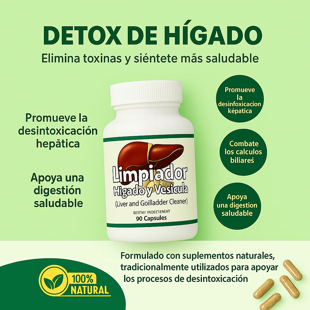 El Limpiador de Hígado & Vesícula es una fórmula natural con boldo y cardo mariano que apoya la desintoxicación del hígado y protege sus células. También favorece una digestión más eficiente para absorber mejor los nutrientes de los alimentos. Con el uso regular, ayuda a reducir la inflamación y mantener un sistema fuerte y resistente, siendo una manera sencilla y segura de cuidar tu bienestar diario.