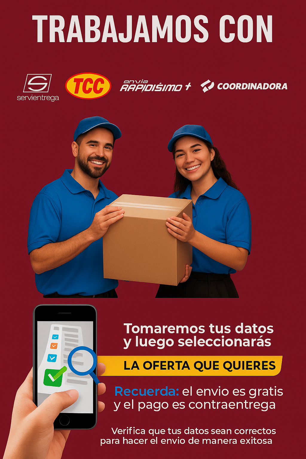 Manejamos envíos gratis con servicio pago contra entrega a todo el país nuestro tiempo de entrega es de 2 a 4 Días Hábiles recuerda tener el dinero completo en EFECTIVO en el momento de la entrega Para que no tengas novedades con la recepción de tu pedido