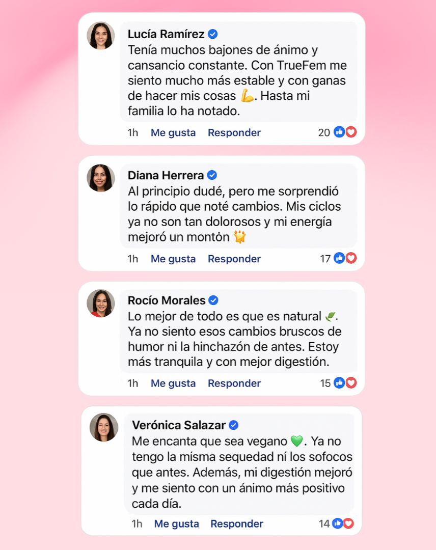 Desde que empecé a tomar TrueFem Balance, noté una gran mejoría en mi estado de ánimo y energía. Ahora mis días son mucho más llevaderos